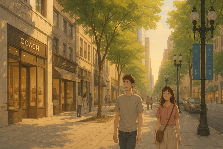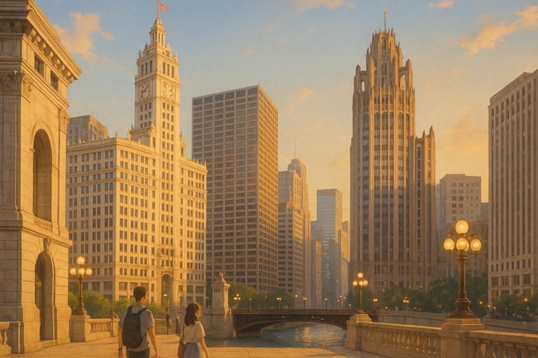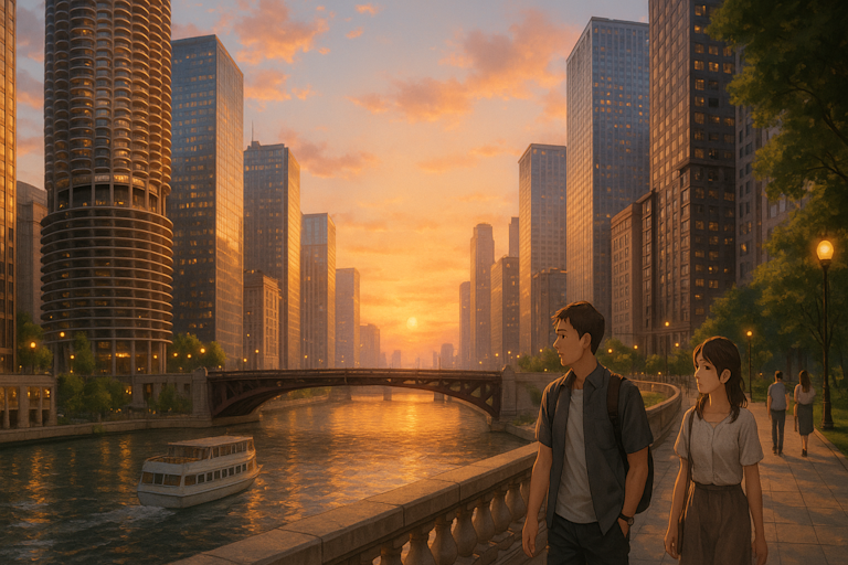 Cool lake air glides between towering steel and glass as the scent of deep-dish pizza drifts through Riverwalk.