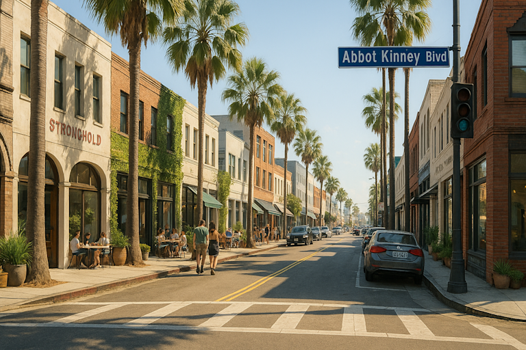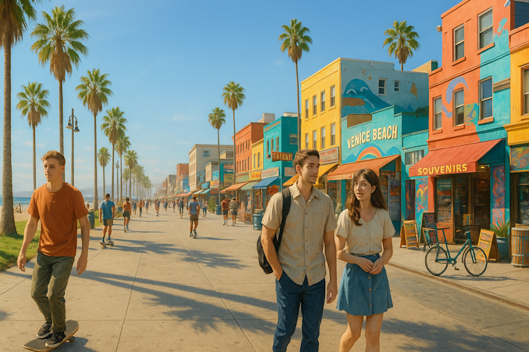 Golden sunlight spills over palm-lined streets as ocean breeze carries the scent of tacos and surf wax along Venice Beach.