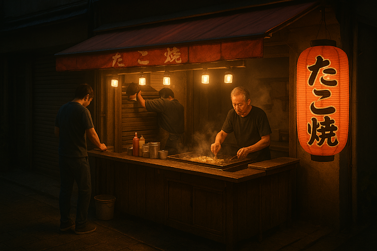 Lantern-lit food stalls sizzle along Dotonbori as the scent of fresh takoyaki drifts through neon reflections on the canal.