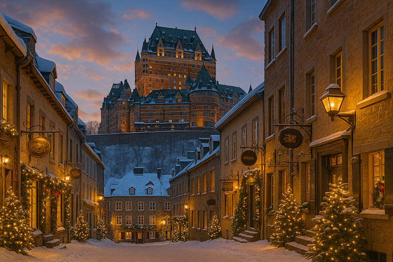 Lantern-lit snowflakes drift over stone walls as the scent of fresh pastries warms the alleys of Old Quebec.