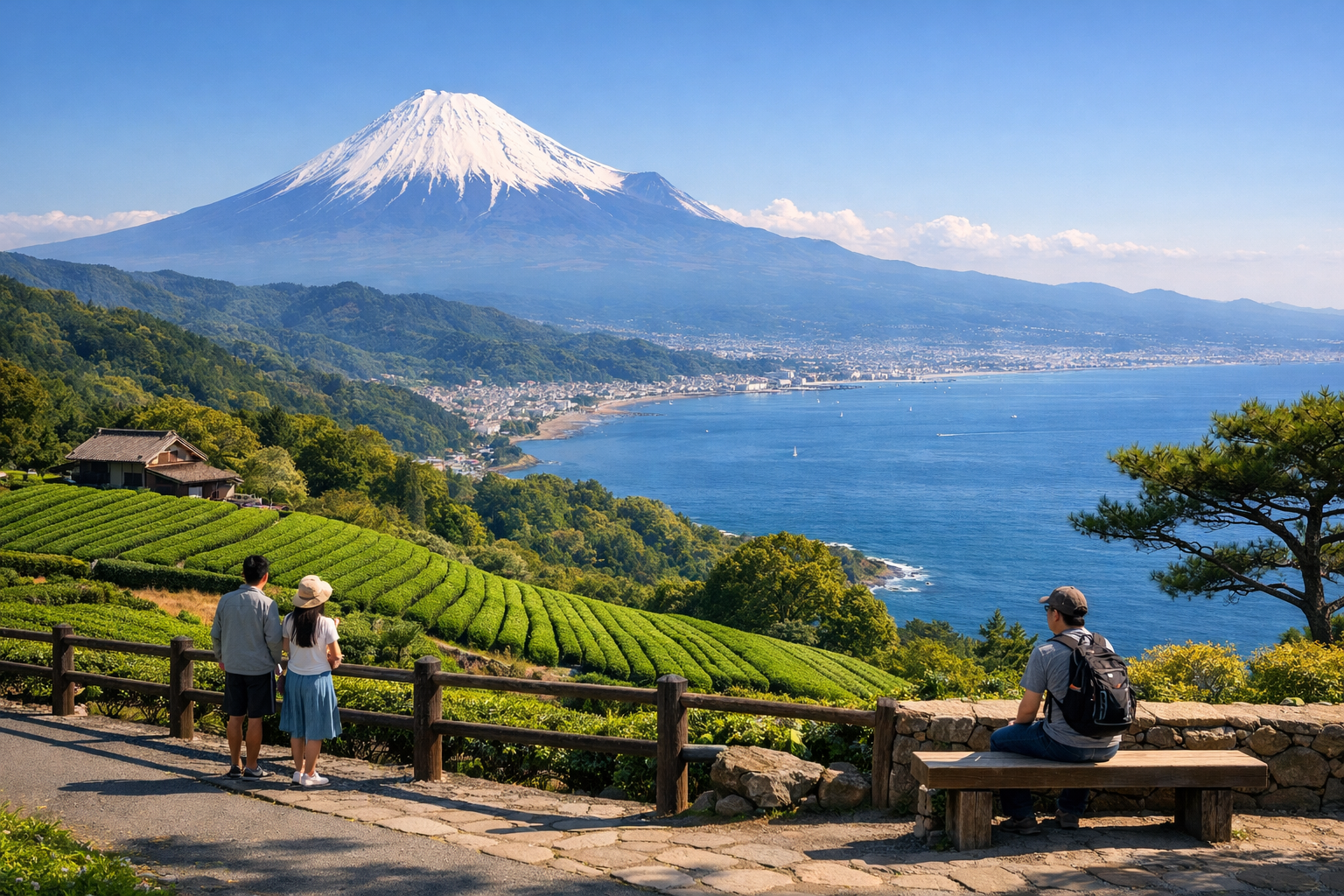 Morning mist lifts from emerald tea fields as waves roll in from Suruga Bay and Mount Fuji sharpens against the sky.