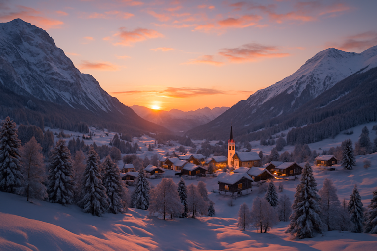 Morning sun ignites snow-bright peaks as pine-scented air drifts across quiet mountain villages and glacier-fed lakes.