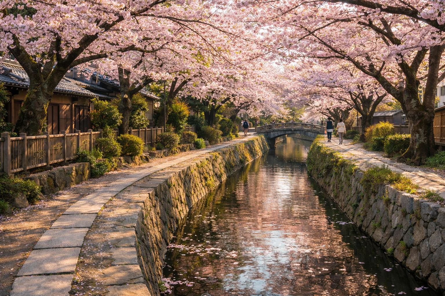 A peaceful stone walkway along a cherry-lined canal, especially beautiful during spring blossoms.