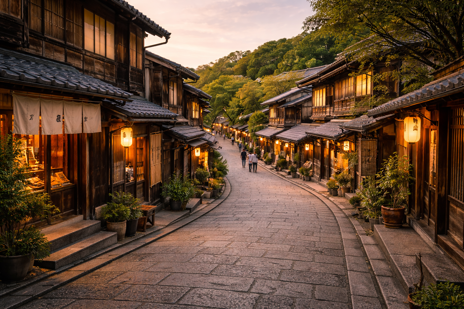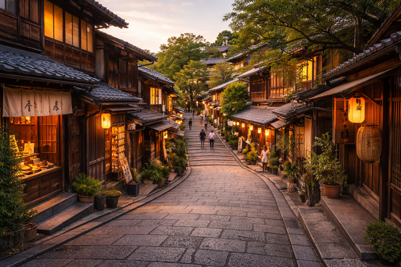 A charming stone-paved slope lined with traditional wooden buildings, tea houses, and shops.