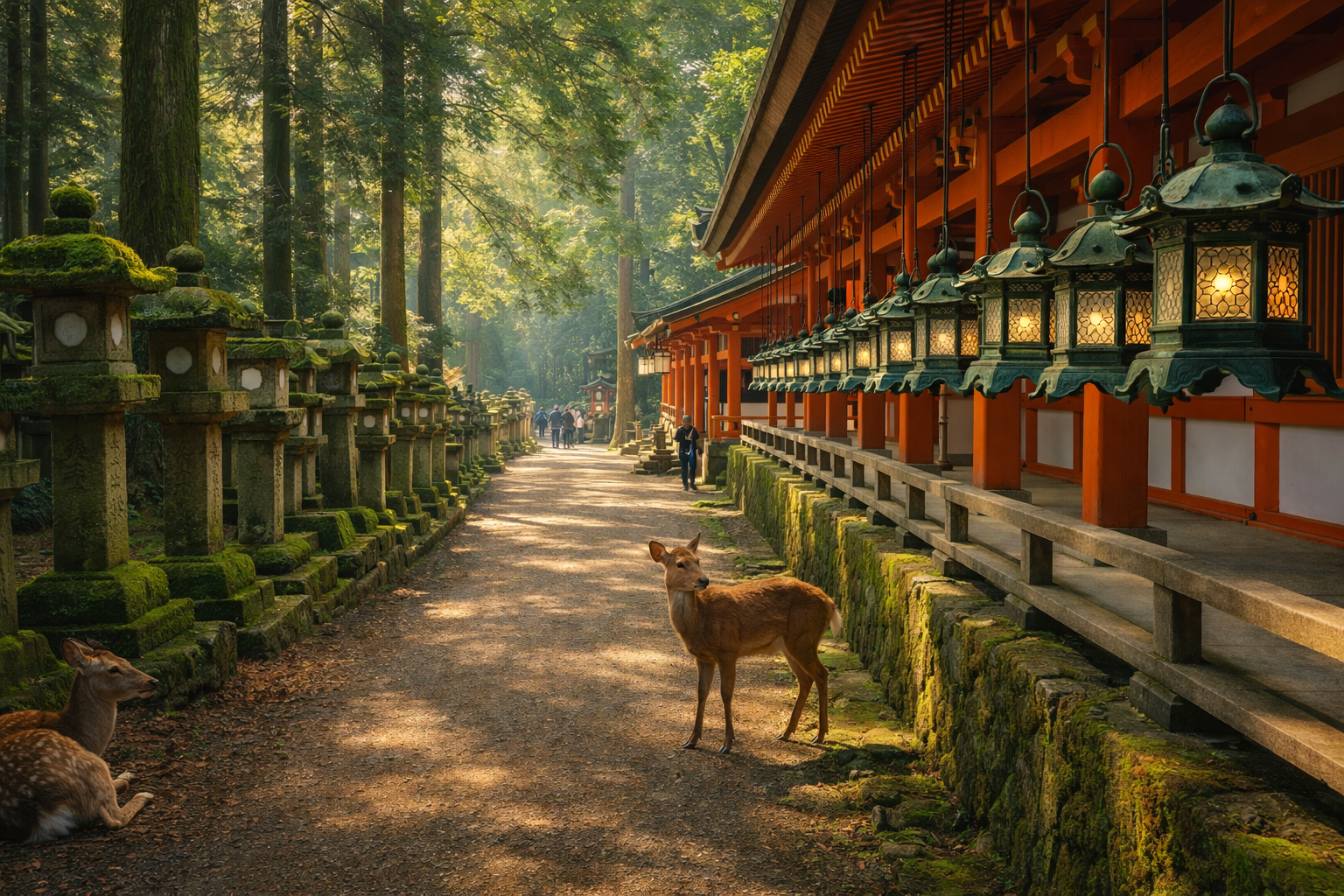 A short train ride takes you to Nara. Enter Nara Park and meet the deer under broad trees; they’re curious companions and excellent for candid photos. Visit Todai-ji to stand beneath the Great Buddha — the scale hushes crowds. Finish at Kasuga Taisha’s lanterned paths for an atmosphere that feels suspended in time.